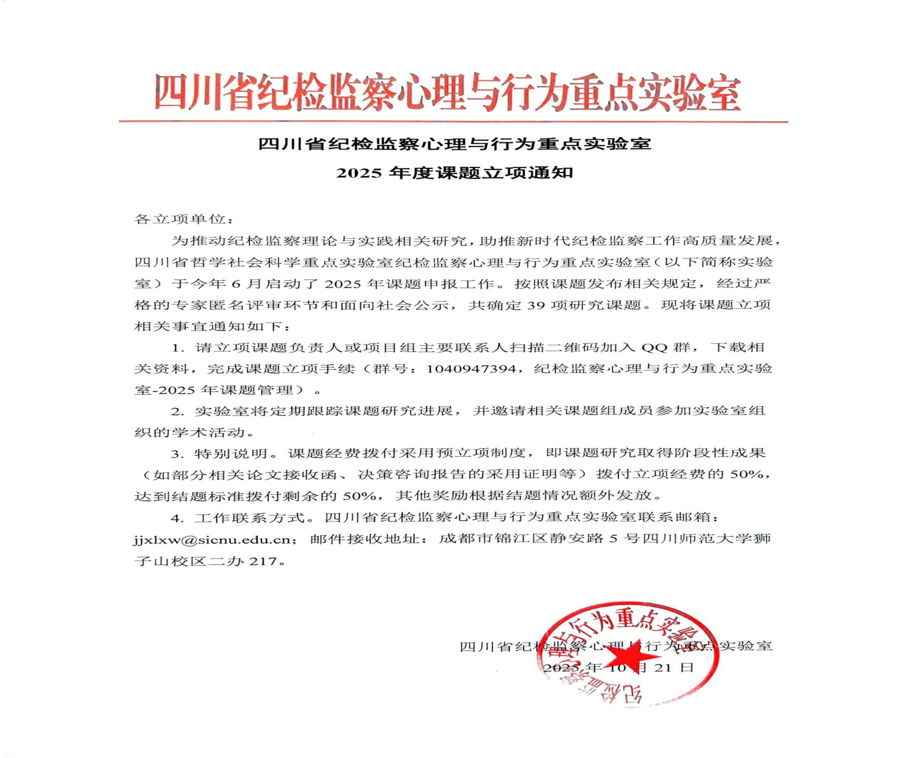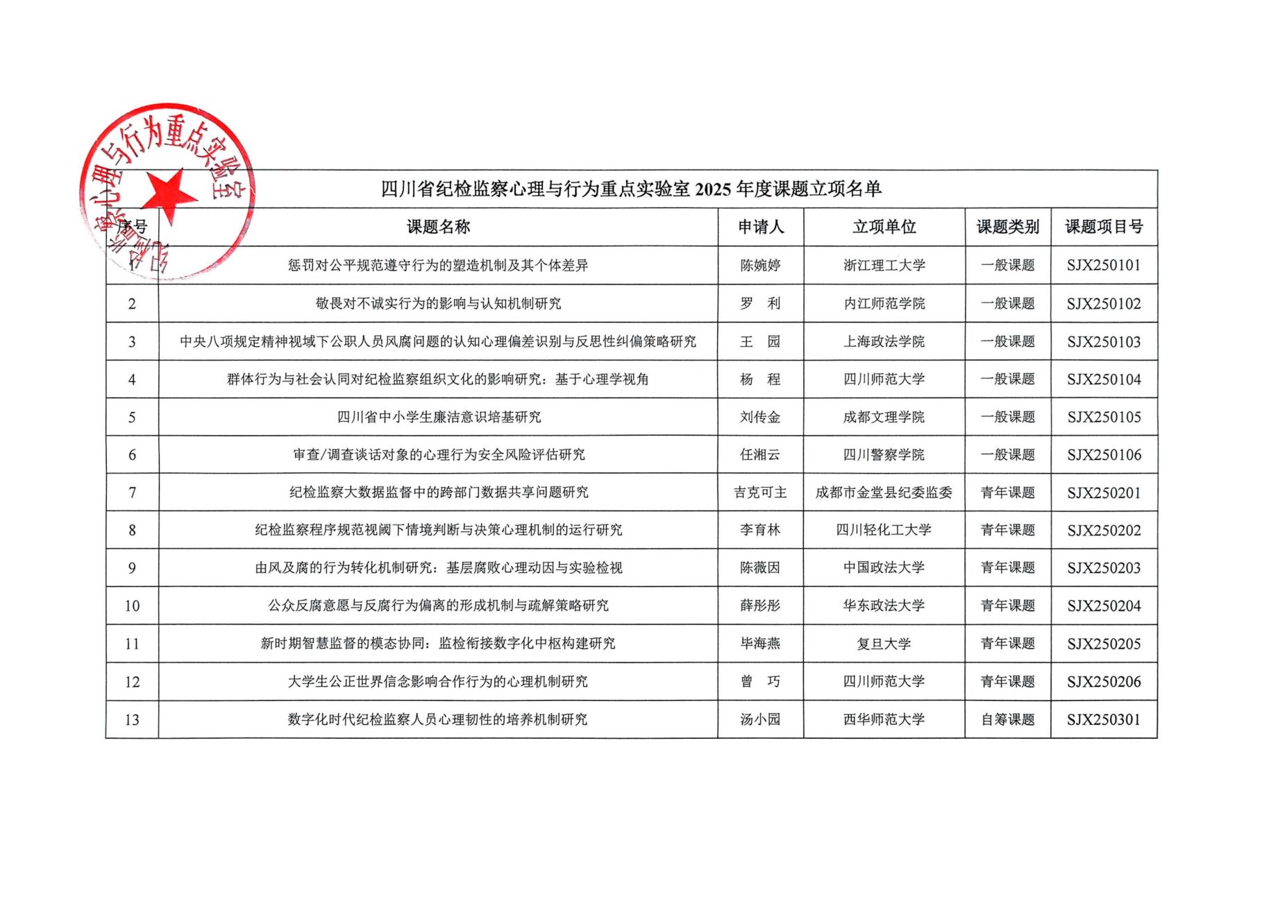 四川省纪检监察心理与行为重点实验室(四川省首批省级哲学社会科学重点实验室)2025年立项结果公布,公司刘传金老师主持的课题《四川省中小员工廉洁意识培基研究》获得立项。